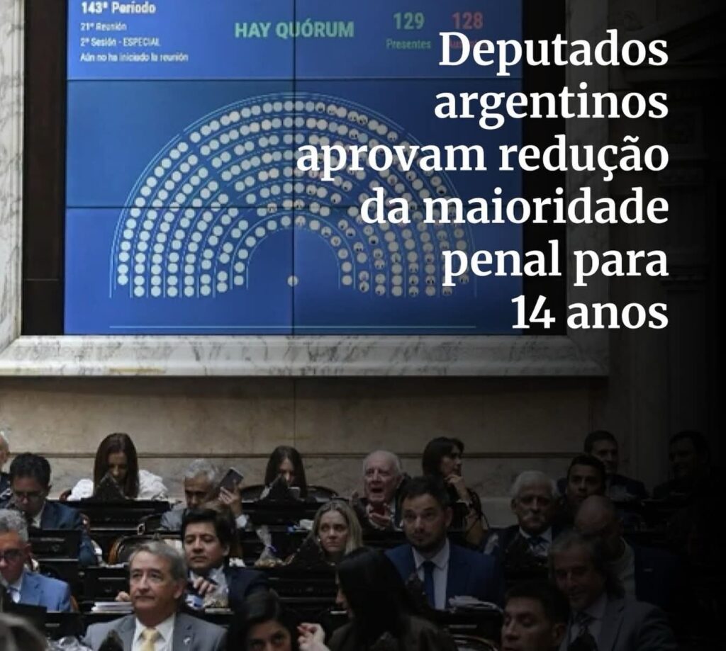 A Câmara dos Deputados da Argentina aprovou nesta quinta-feira (12) um projeto que altera o Regime Penal Juvenil do país e reduz a idade mínima de responsabilização criminal de 16 para 14 anos. A proposta recebeu 149 votos favoráveis e 100 contrários, sem abstenções, e agora será encaminhada ao Senado para análise.