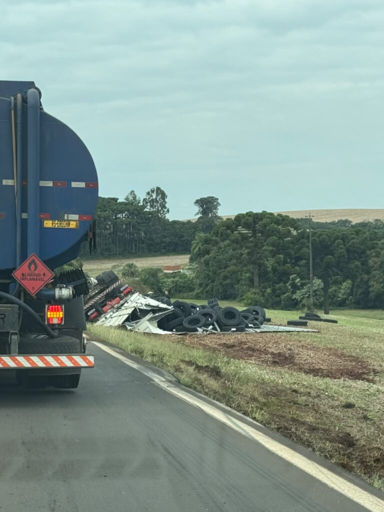 De acordo com informações repassadas por ouvintes, o veículo saiu da pista e acabou tombando às margens da rodovia. Com o impacto, a carga de pneus foi lançada para fora do caminhão, ficando espalhada sobre a pista, na vegetação ao redor e até em uma lavoura próxima.