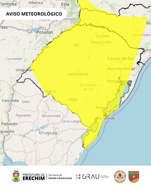 O alerta também abrange outras áreas do Sul do Brasil, incluindo regiões de Santa Catarina e do Paraná. No Rio Grande do Sul, municípios do Alto Uruguai, como Erechim, estão dentro da área de abrangência.