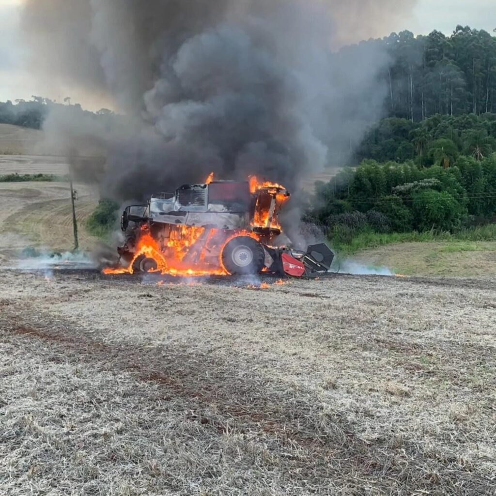 De acordo com informações dos Bombeiros Voluntários, a ocorrência foi registrada por volta das 17h30. Quando a equipe chegou ao local, a máquina agrícola já estava completamente envolvida pelas chamas, o que dificultou o controle inicial do fogo.