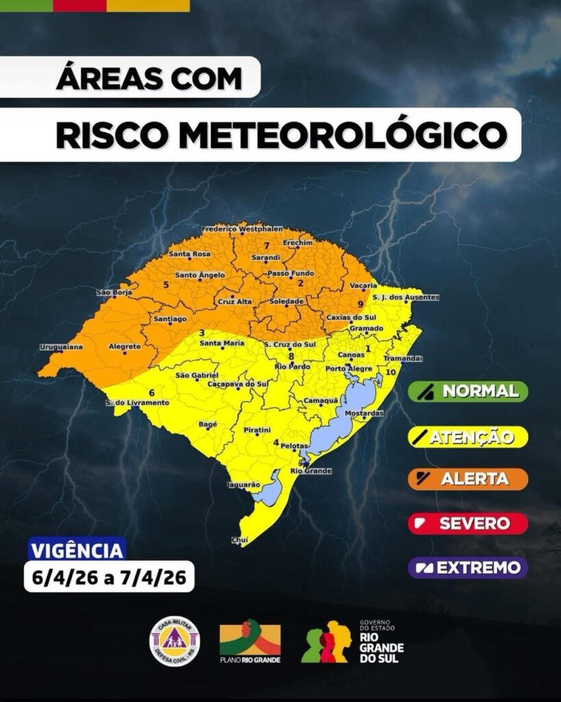 O Rio Grande do Sul deve enfrentar um período de instabilidade nos próximos dias, com previsão de temporais intensos entre segunda-feira (06) e terça-feira (07). De acordo com o Centro de Monitoramento da Defesa Civil, a formação de um ciclone extratropical, associada ao avanço de uma frente fria, deve provocar chuva forte, rajadas de vento intensas e possibilidade de granizo em diversas regiões do Estado.