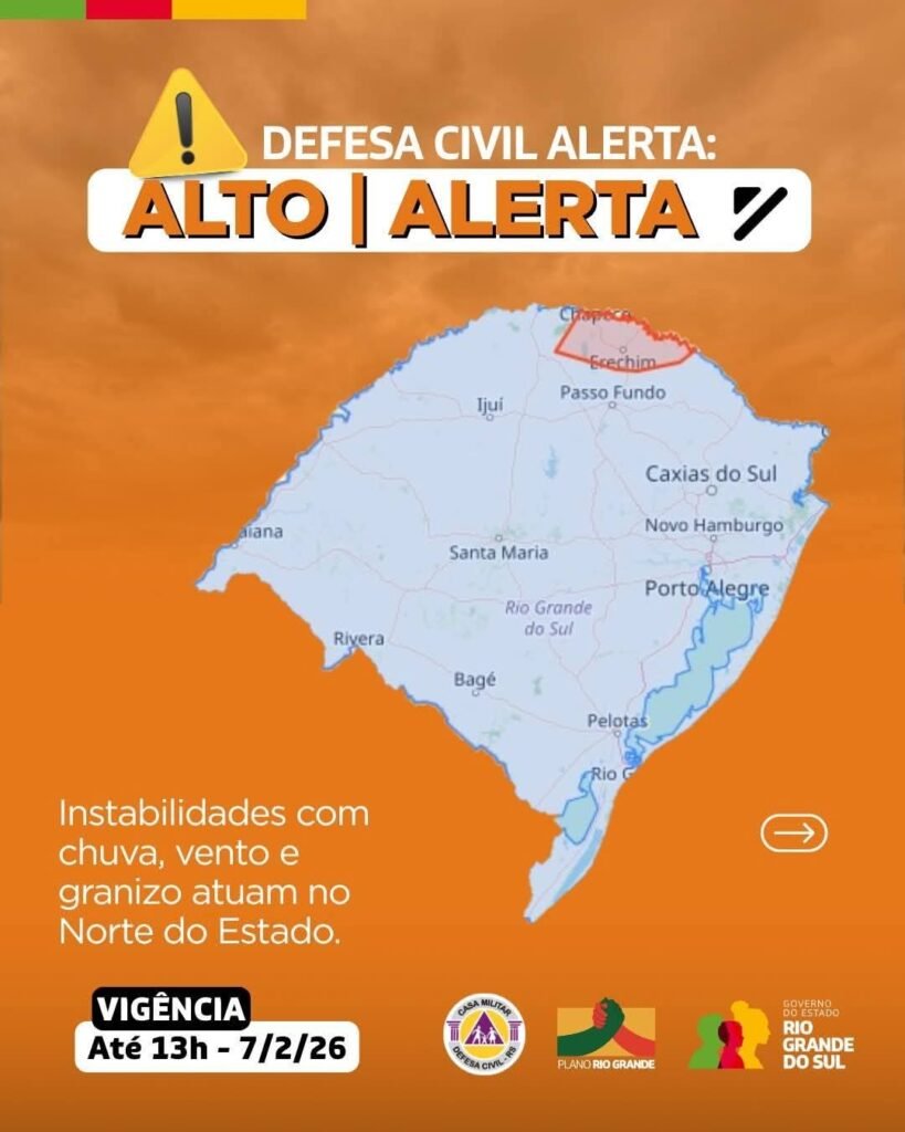 A Defesa Civil emitiu um aviso de condição de alerta para o Norte do Estado devido à atuação de instabilidades climáticas. A previsão indica a ocorrência de chuva intensa, rajadas de vento e possibilidade de granizo, com validade até as 13h desta sexta-feira, 7 de fevereiro.