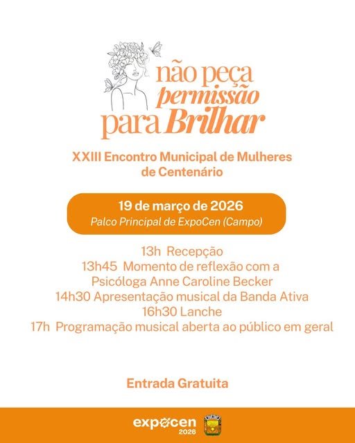 O Encontro Municipal de Mulheres de Centenário será realizado no dia 19 de março de 2026, reunindo moradoras do município para uma tarde dedicada à valorização da mulher, reflexão e integração comunitária. O evento acontecerá no Palco Principal da ExpoCen (Campo), em Centenário, município localizado na região Norte do Rio Grande do Sul.