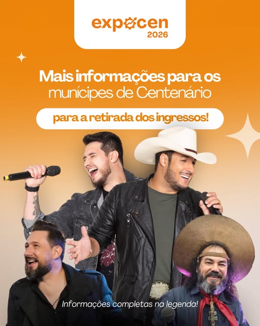 De acordo com a Prefeitura de Centenário, cada morador precisa comparecer pessoalmente ao prédio da administração municipal para retirar seu ingresso VIP da EXPOCEN 2026.