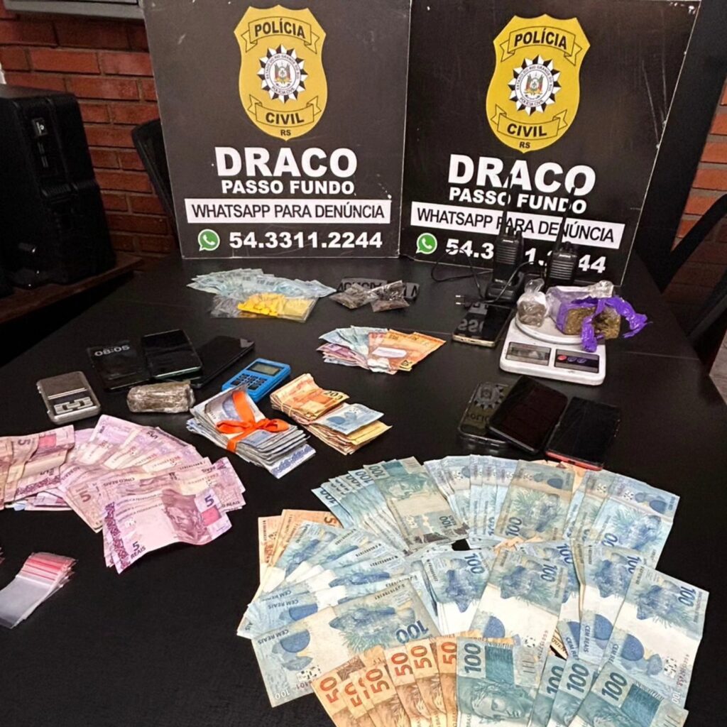 Além das prisões, os policiais cumpriram 36 mandados de busca e apreensão nas cidades de Passo Fundo, Casca, Santo Antônio do Palma e Paraí. Durante as diligências, foram apreendidas diversas porções de drogas, como maconha, cocaína, crack e ecstasy, além de dinheiro, veículos, telefones celulares e outros materiais relacionados ao tráfico.