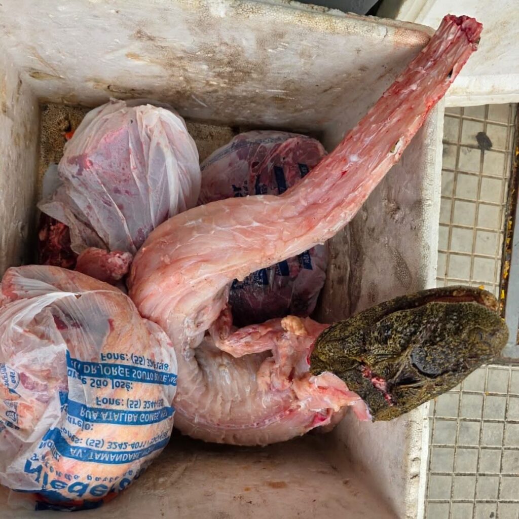 Durante o cumprimento de mandados, os policiais encontraram carne de animais silvestres abatidos de forma ilegal, entre eles capivaras e até jacarés — espécies protegidas por lei no Brasil, cuja caça e comercialização são proibidas.