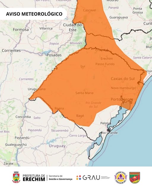 Embora o foco da Previsao do tempo também impacte Erechim e o norte do Rio Grande do Sul, o aviso meteorológico abrange uma área ampla do país. Estão sob alerta os estados de Santa Catarina, Paraná, Mato Grosso do Sul e São Paulo, além de todo o território gaúcho.