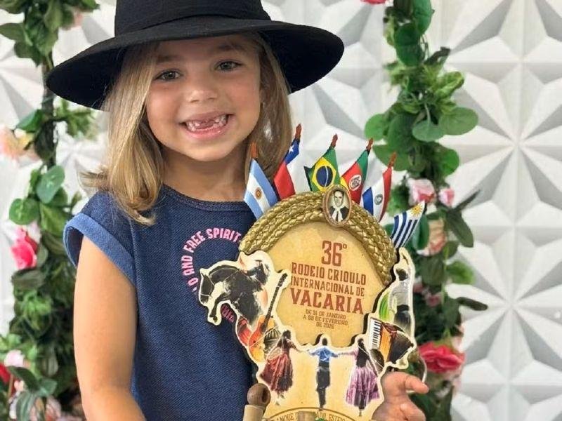 Aos cinco anos de idade, Antônia Silveira Ritter viveu um momento especial no Rodeio Internacional de Vacaria, ao conquistar o título na modalidade “bonequinha”, na prova da vaca parada. Além do troféu, a pequena laçadora chamou atenção por um gesto de solidariedade: após a vitória, ela decidiu doar o cabelo para a Liga Feminina de Combate ao Câncer de Campo Bom, na Região Metropolitana de Porto Alegre, onde mora.